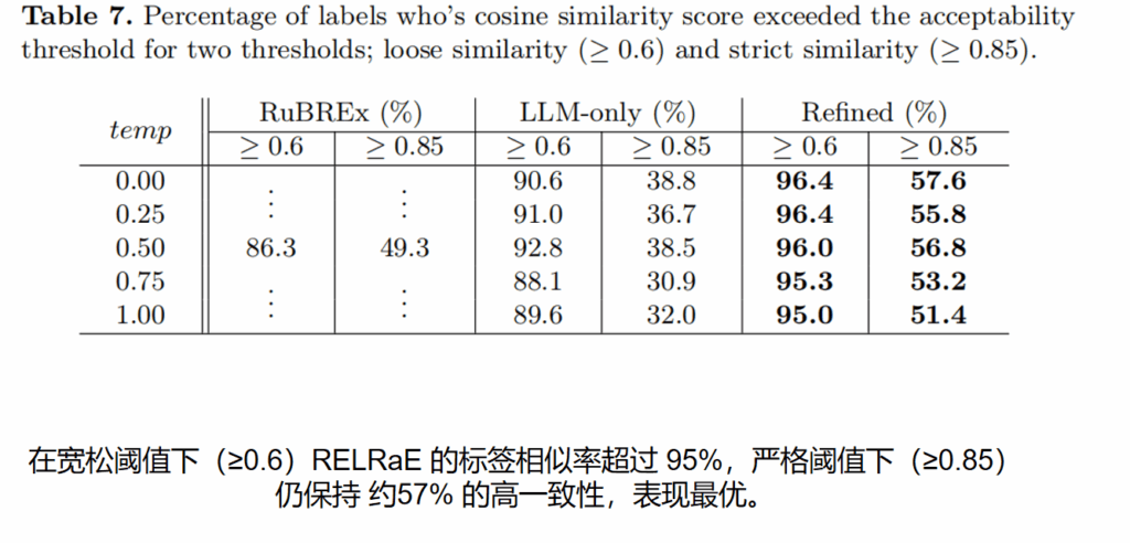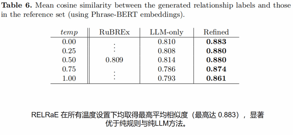 实验结果:RELRaE 在标签准确性上显著优于纯规则或纯LLM方案;LLM评审机制可替代部分专家审核工作。