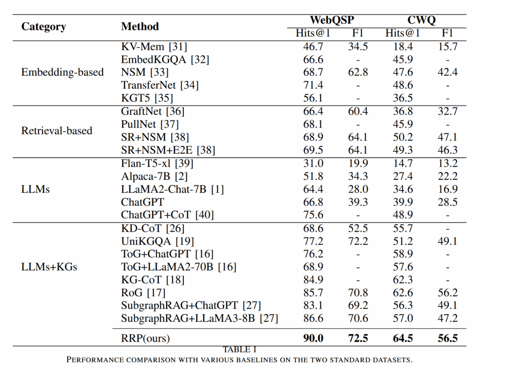 4. 验证效果:在WebQSP和CWQ等经典KGQA数据集上验证,RRP显著提升性能,且仅需7B参数量的小型模型即可实现优异表现。