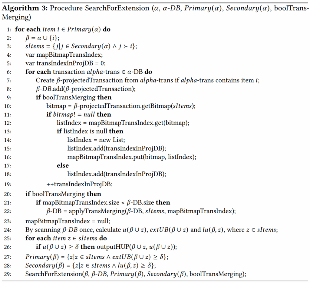 构建β-DB(扩展项集的投影数据库),secondary中获取可扩展项,在判断是否进行事务合并,扫描 β-DB,计算 u(β∪z)、extUB(β∪z)、lu(β,z):