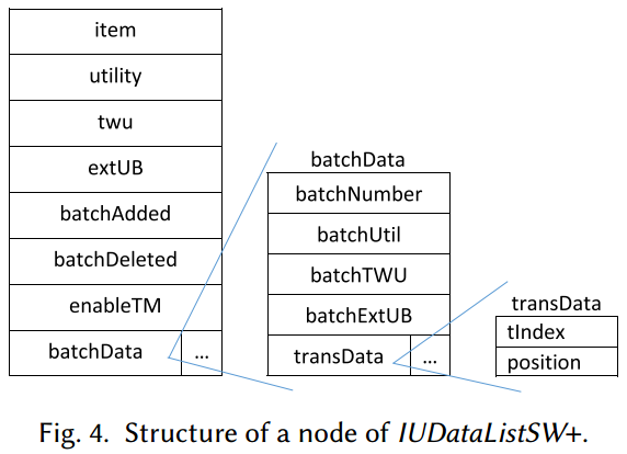 - 提出了名为IUDataListSW+的数据结构,用于存储和维护当前滑动窗口中的每个项的效用值、上界值及其在事务中的位置,从而高效获取投影数据库