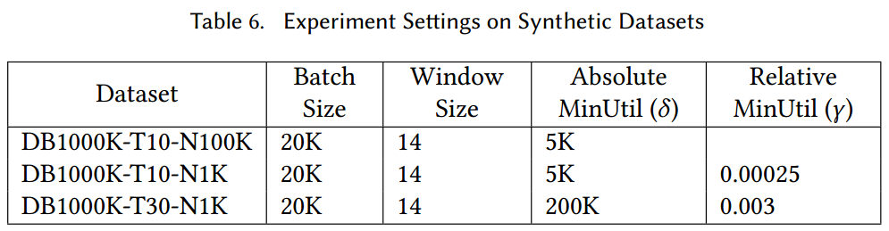 对SHUGrowth、HUPMS、HUPM_Stream、SOHUPDS、SOHUPDS+等算法在不同数据集内进行比较,以下是其真实数据集、合成数据集及其默认参数