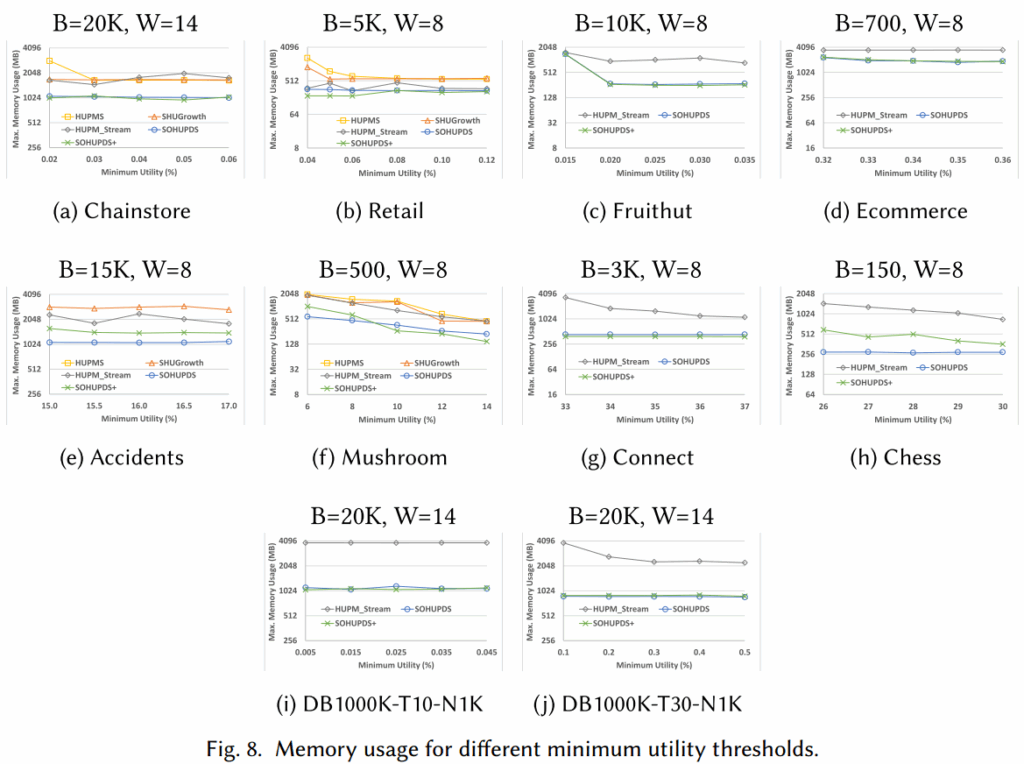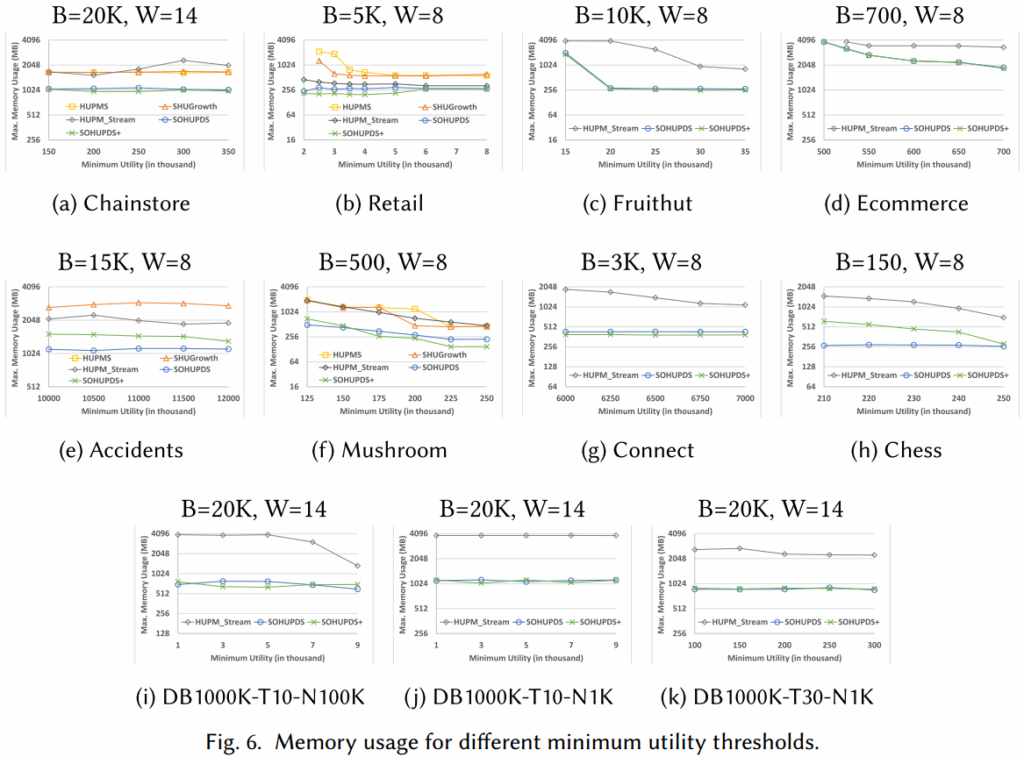 - 内存使用:SOHUPDS/SOHUPDS+的内存消耗始终最少,SOHUPDS/SOHUPDS+通过直接计算真实效用值以及紧致的上界,避免了候选集爆炸的情况,且SOHUPDS+虽然增加了位图结构,但其计算效率远超其内存开销