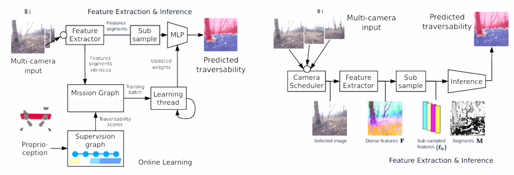 - 在线自监督机制:机器人根据自身速度反馈计算可通行性得分(traversability score),作为训练标签;