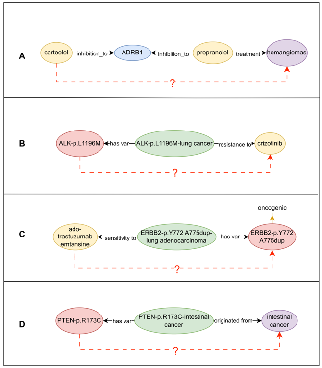 (A) 药物重定位:KGT通过分析知识图谱,发现卡替洛尔和另一种已用于治疗血管瘤的药物普萘洛尔,都作用于同一个靶点ADRB1。基于此,KGT提出了一个极具价值的科学假设:卡替洛尔或许也能用于治疗血管瘤。这为新药研发提供了重要线索。