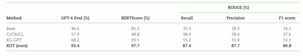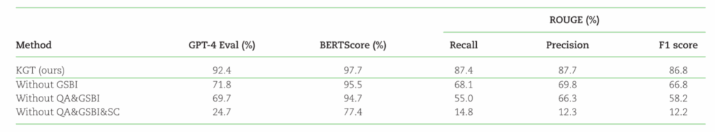 表3展示了KGT与其他知识图谱问答方法的对比结果。可以看到,KGT在GPT-4评估、BERTScore和ROUGE等所有指标上,都取得了压倒性的优势。特别是在最重要的F1分数上,KGT比之前最好的方法KG-GPT提升了33个百分点!这主要是因为KGT通过模式推理,能更好地理解生物医学问题中的实体类型和复杂关系。
