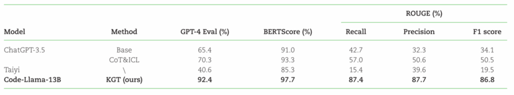 为了进一步展示KGT的普适性,我们将其与通用和生物医学领域的顶级大模型直接对比。如表所示,即使是“KGT + 开源的Code-Llama”组合,其性能也远超“ChatGPT-3.5 + 增强提示”和专业的医学大模型Taiyi。F1分数甚至比ChatGPT-3.5高出52.7%。