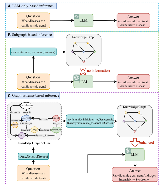 A)这是传统的大语言模型(LLM)单独回答问题的方式。它完全依赖模型内部的知识,但常常会产生事实错误,也就是我们常说的“幻觉”,这在要求严谨的生物医学领域是致命的。