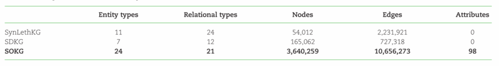 首先,我们使用了一个大规模的泛癌症知识图谱,名为SOKG。从表中数据可以看出,SOKG的规模远超同类知识图谱,拥有超过364万个实体和1065万条关系,并且包含了98种属性类型。这为我们的研究提供了坚实、丰富的数据基础。