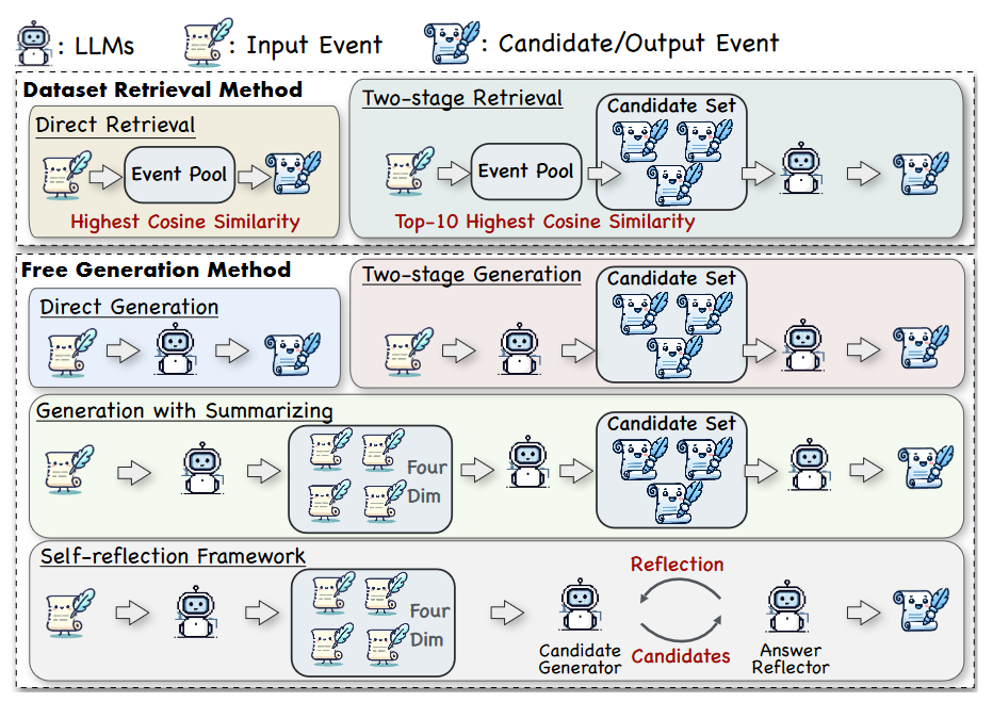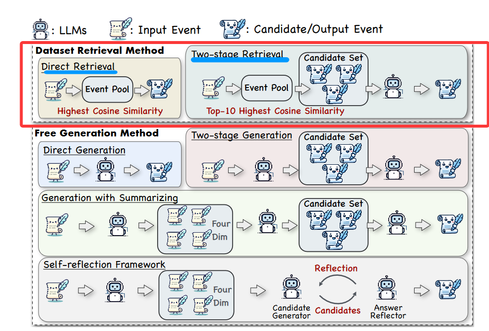 创新点:先将输入事件和候选事件分别按四个维度(Topic, Background, Process, Result)结构化摘要(由GPT-4完成),再基于这些摘要进行比较和选择。