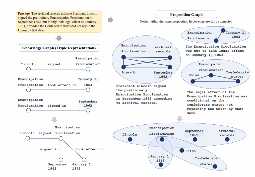 2. 于是作者提出一种用命题替代三元组来连接实体的方案,即命题内部的所有实体的关系由命题本身定义;而出现在多个命题之间的实体可以将多个命题之间的实体联系起来;