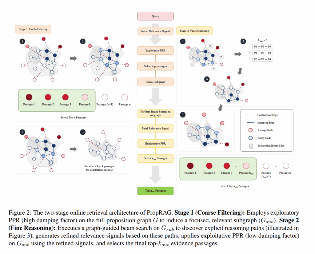 3. 作者提出了一种 PageRank 结合集束搜索的两阶段检索方案来在这样的命题图谱上执行搜索,这个搜索方案是不需要 LLM 参与的;
