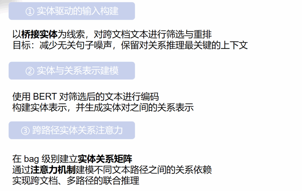 利用 桥接实体 构建有效的文档上下文筛选机制,增强跨文档关系推理所需的语义连贯性。