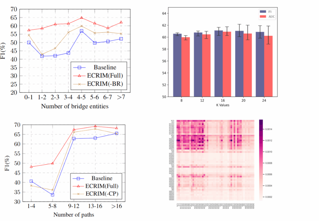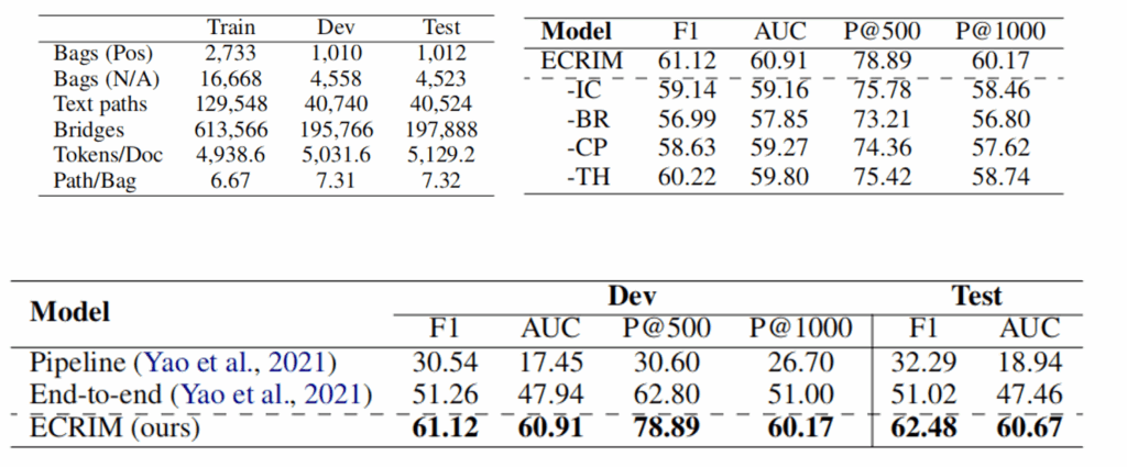 3.在 CodRED 数据集上的实验结果表明,ECRIM 在 F1 和 AUC 等指标上显著优于现有方法,验证了实体中心建模与跨路径关系交互在跨文档关系抽取任务中的有效性。