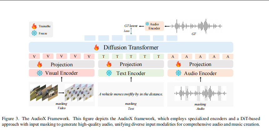 AudioX 采用 “多模态编码器 + 投影层 + Diffusion Transformer(DiT)” 的统一架构,在潜空间中完成多模态条件建模与音频生成。模型以文本(Text)、视频/图像(Video)、音频(Audio)作为输入条件,输出高质量音频或音乐波形。