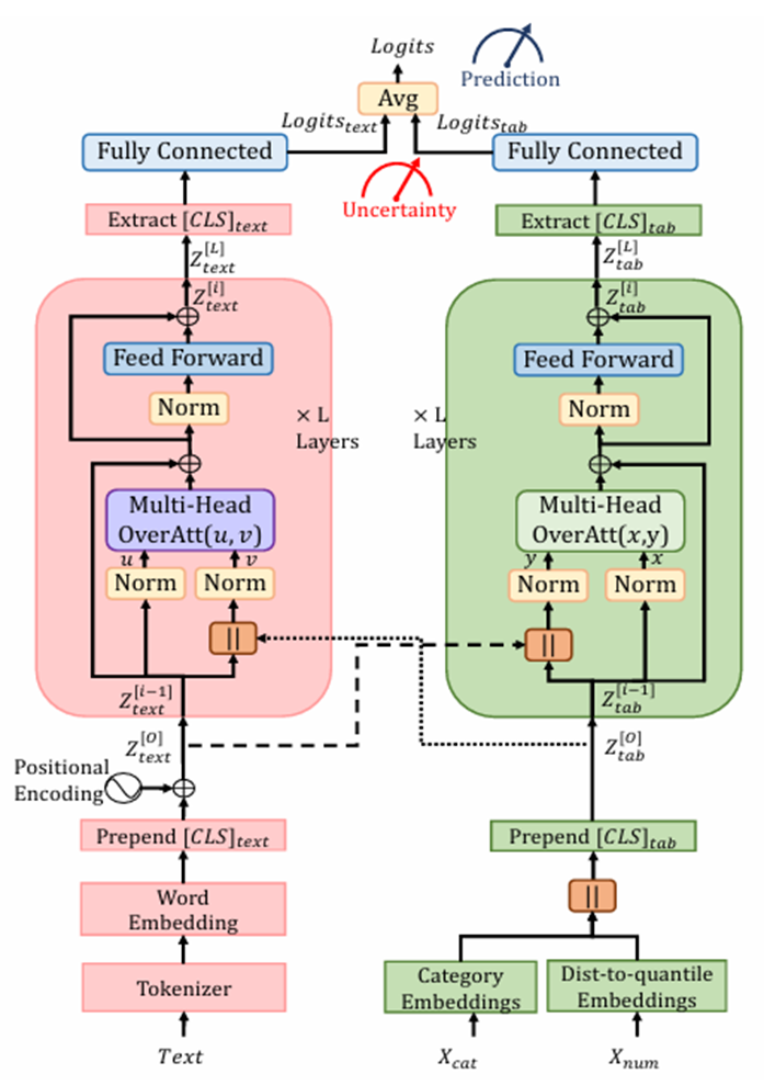 2)核心处理阶段:每一层用两个独立的模块,分别更新文本流和表格流,且更新时同时关注对方的信息特征