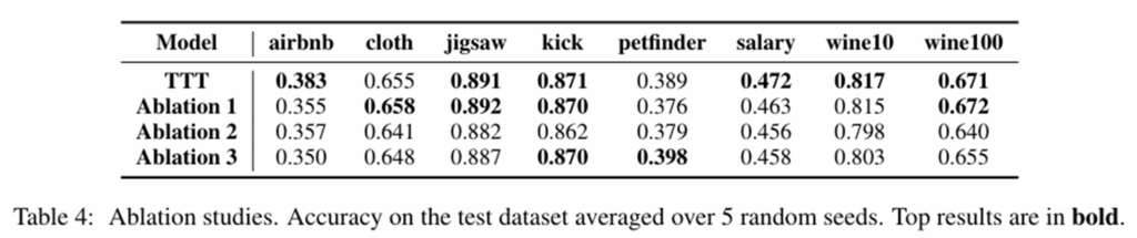 2)Ablation 2性能下降最严重,证明TTT的核心就在于整体注意力机制,与传统注意力机制不同,能够权衡同一层中所有特征。