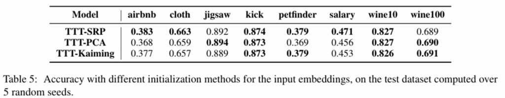 由表5可知,TTT-SRP通常取得最好或接近最好的结果。可能是因为SRP能保留预训练embedding的稀疏结构或语义信号,同时避免过拟合和高维噪声;而PCA会丢失部分语义方向,Kaiming随机初始化没有预训练语义信息。