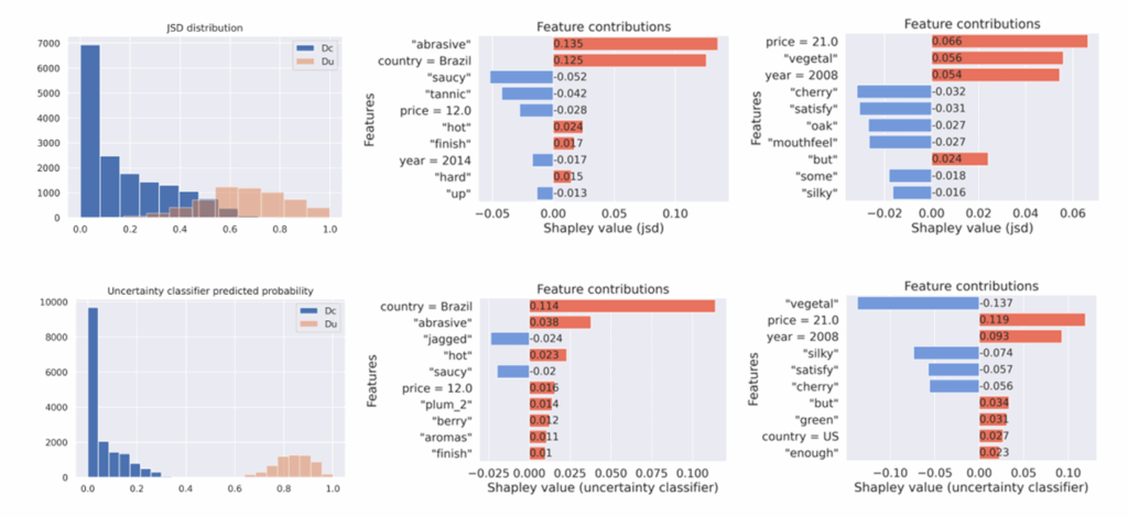 2)中间图表展示了一个具体的不确定样本,并利用Shapley(一种解释性算法)找出来导致模型困惑的特征