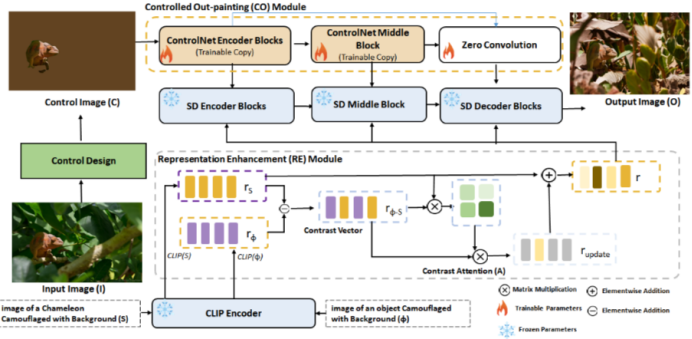 Camouflage Anything 框架: 结合了受控外绘(Controlled Out-painting, CO)和表征工程(Representation Engineering, RE)。不仅能填充背景,还能强制前景物体学习背景的纹理特征。