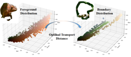 利用最优传输理论中的 Wasserstein-2 距离计算两个分布之间的差异,该距离量化了将前景纹理分布变换为背景纹理分布所需的最小代价。
