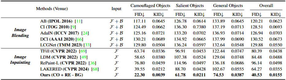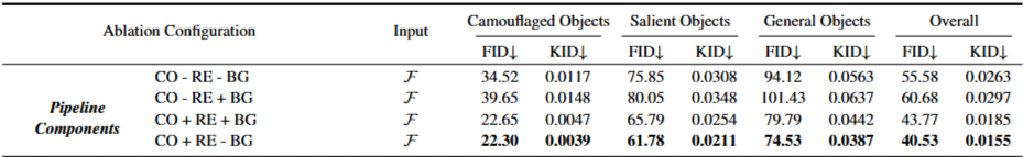 颜色一致性:+BG配置促进前景背景颜色融合。实验观察到一个显著的现象:虽然去除背景颜色控制(-BG)的配置在 FID/KID 指标上表现最佳,但在实际的伪装效果上,引入背景控制(+BG)能促使前景与背景的颜色分布趋于收敛。这揭示了传统生成指标(FID/KID)在评估“伪装”任务时的局限性——即高质量的图像并不等同于高质量的伪装(高对比度物体通常具有更好的 FID,但伪装性差)。