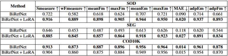 下游任务提升: 使用生成的伪装数据对SOTA分割模型(BiRefNet)进行LoRA微调,显著提升了伪装目标分割(COS)的准确率。