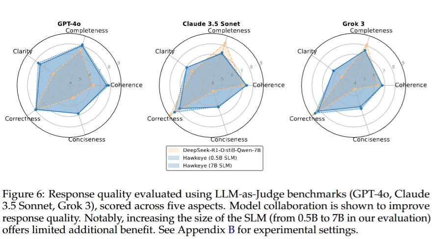 在 GSM8K、MATH、MATH500 等数据集上,HAWKEYE 的准确率相较基线模型仅下降 3%–6%。同时,通过 LLM-as-Judge(GPT-4o、Grok-3、Claude-3.5)在连贯性、清晰度、简洁性等维度进行评估,HAWKEYE 在多项指标上反而优于原始模型,显示出更好的用户可读性。