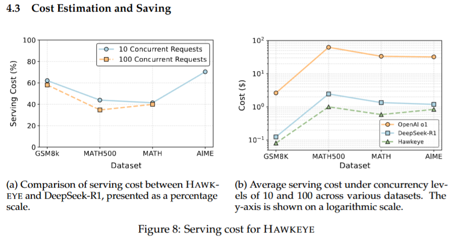 基于真实 API 定价模型的估算结果显示,由于输出 token 数大幅减少,HAWKEYE 在推理成本上相较 OpenAI o1 和 DeepSeek-R1 分别最高可节省 98% 与 59%,突出了该方法在工业级应用中的经济优势。