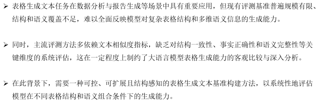 3)实验结果表明,现有模型在复杂表格结构理解、多属性语义组合和事实一致性方面仍存在明显不足,凸显了构建高质量评测基准对于推动表格生成文本研究的重要性。