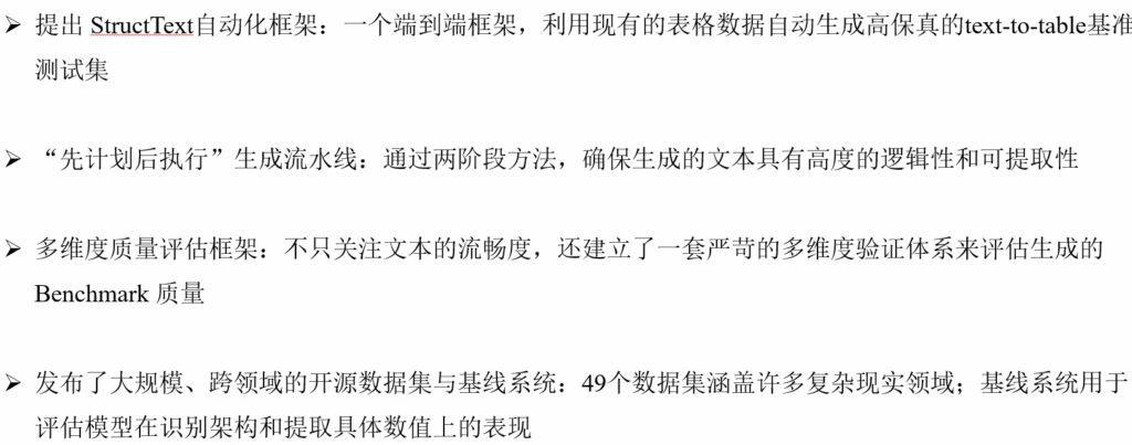 1)本文提出了 StructText,一种可控的合成式表格生成文本基准,并配套设计了多维度评估体系,以系统衡量模型在结构理解、语义组合和事实一致性等方面的生成能力。