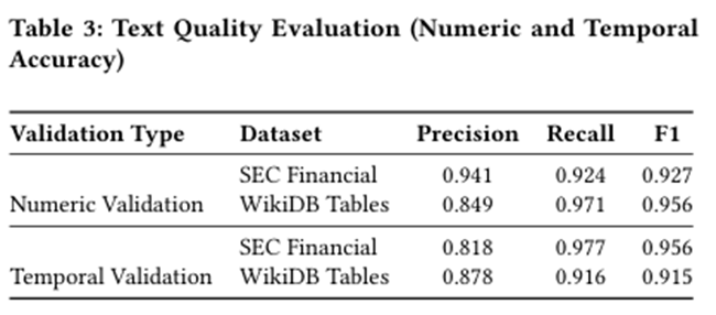 F1分数高,表明生成文本和原始表格匹配度高,从而证明了合成的基准数据集高度可靠