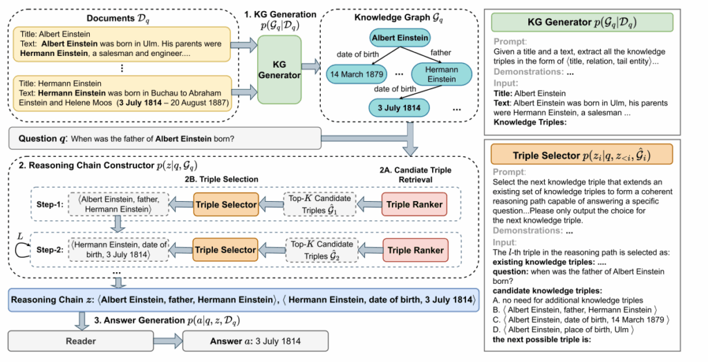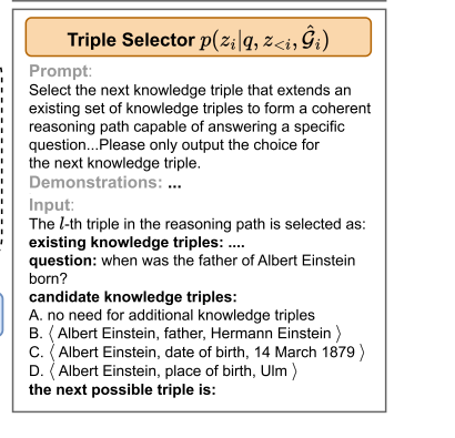 作用:通过自回归方式逐步构建推理链,确保每一步选择的三元组与问题、已有三元组逻辑一致,最终整合支持证据回答问题。