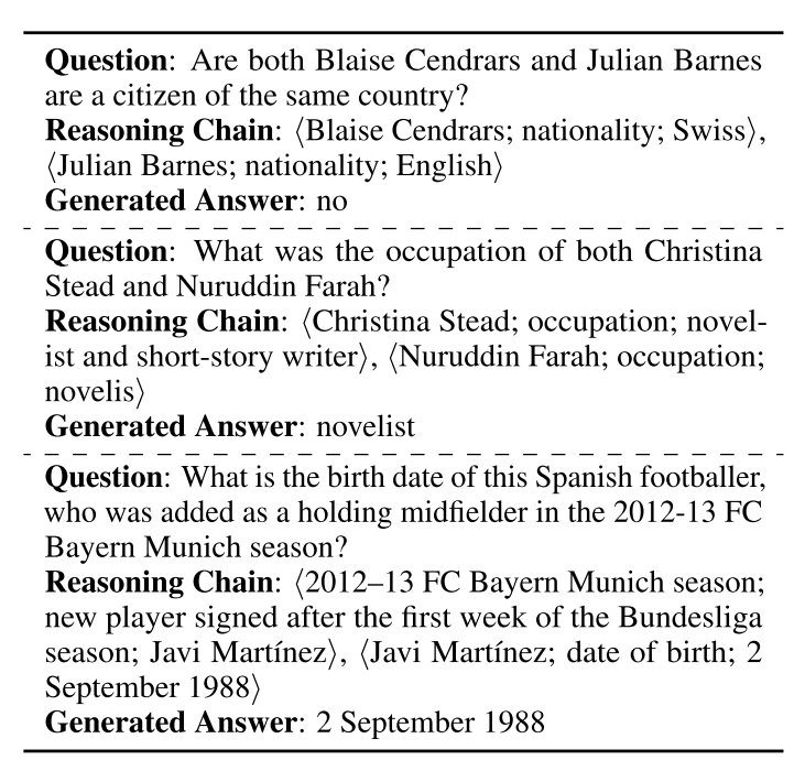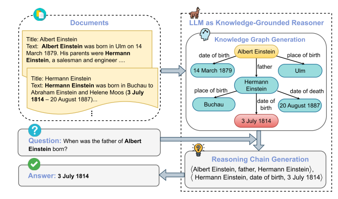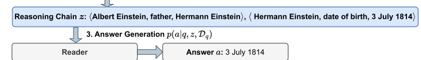 具体问题的推理链示例(如“父亲出生日期”问题,展示⟨Albert Einstein, father, Hermann Einstein⟩→⟨Hermann Einstein, date of birth, 3 July 1814⟩的推理过程。