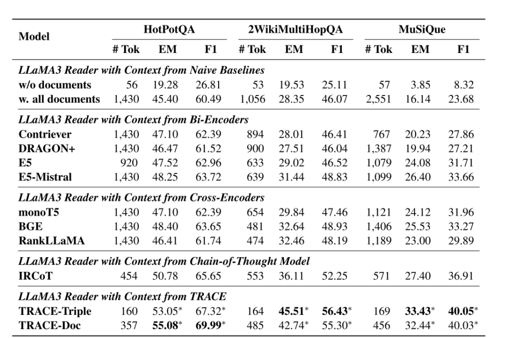 实验结果表明,相比基线(如w. all documents),TRACE-Triple平均EM提升14.03%,TRACE-Doc提升13.46%,证明框架能有效提升多跳QA性能。