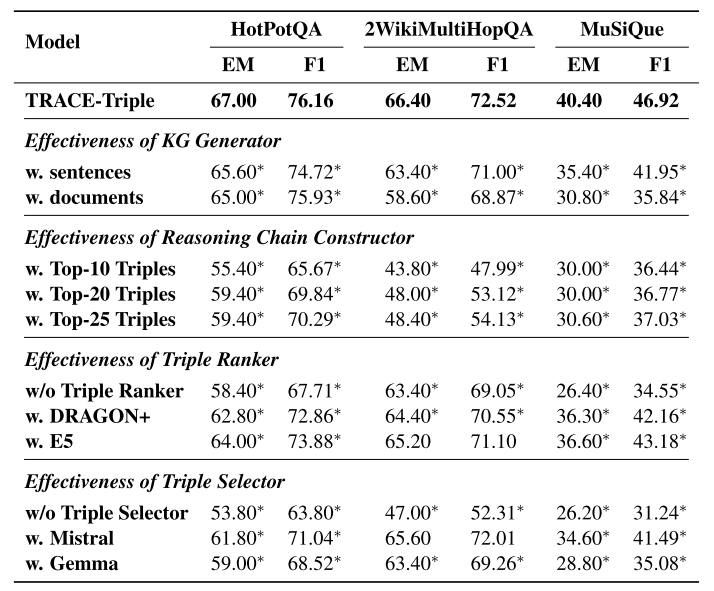 验证Triple Ranker/Triple Selector的必要性:去掉任一组件性能下降,说明“排序+选择”的双阶段设计是推理链质量的关键。