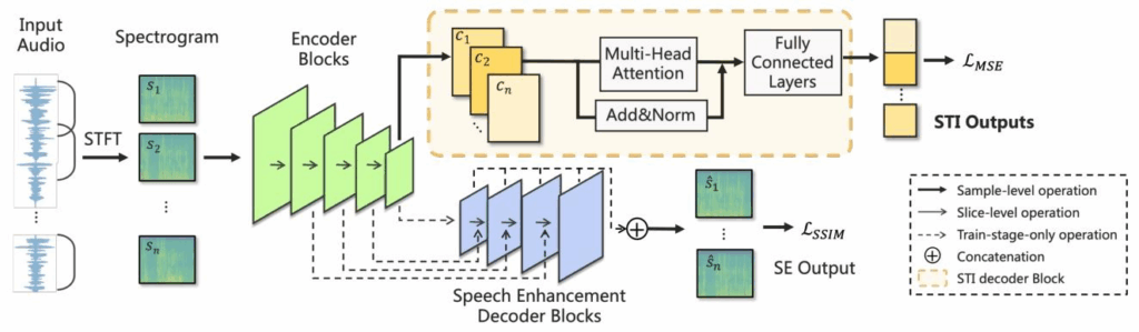 eSTImate 是端到端深度学习系统,采用多任务辅助学习框架,将 STI 盲估计作为主任务,语音增强(SE)作为辅助任务,结合特征金字塔网络(FPN)和多头自注意力机制,模型训练时共享编码器,推理时可舍弃辅助任务解码器以提升速度。