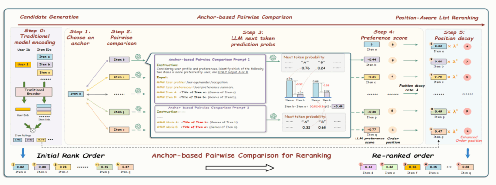 提出“锚点成对比较”机制,实现高效且一致的LLM重排序:所有候选商品仅与一个固定锚点进行语义比较,将复杂度从O(K^2)降至O(K) ,同时消除多轮比较中的传递不一致性。