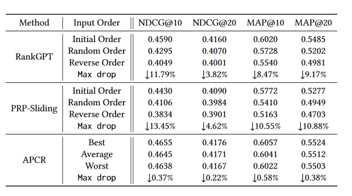 验证 APCR 是否像某些 Listwise 方法(如 RankGPT)那样对输入列表的初始顺序高度敏感。