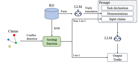 4.设计面向冲突消解的“三元组翻译”提示策略。设计了独特的Prompt构造方法,特别是“三元组翻译”(Triple Translation)环节。它不是直接将三元组扔给LLM,而是先从KG中采样相关事实,让LLM(或预处理模块)将其生成一段自然的实体描述文本,作为Few-shot演示注入Prompt。