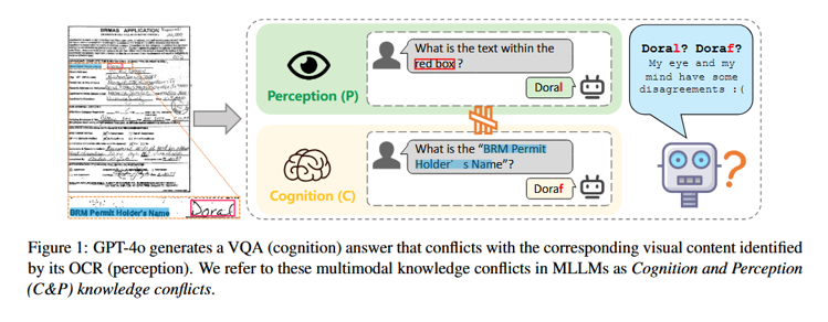 认知与感知的二元对立:作者认为 MLLM 内部存在两个并行的过程。感知(Perception)负责将图像像素转化为文本序列(OCR),认知(Cognition)负责根据指令生成语义答案(VQA)。