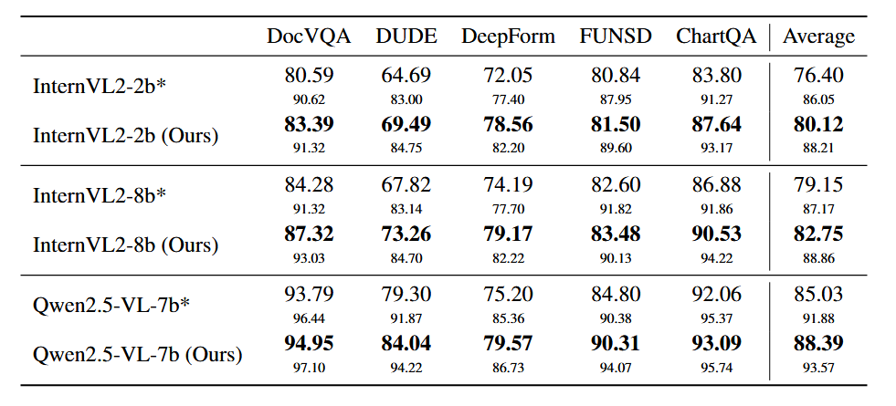 在 DocVQA、DeepForm 等五个主流文档理解数据集上进行测试,覆盖了表格、表单、图表等多种文档形态。